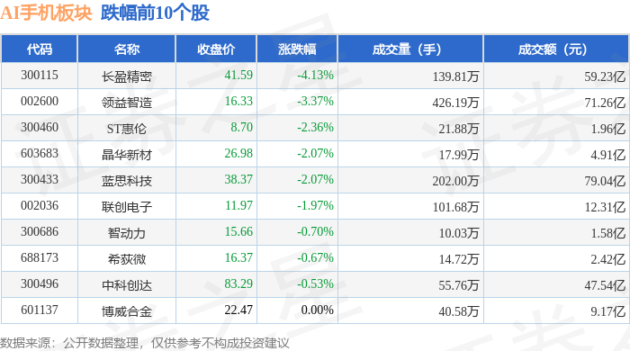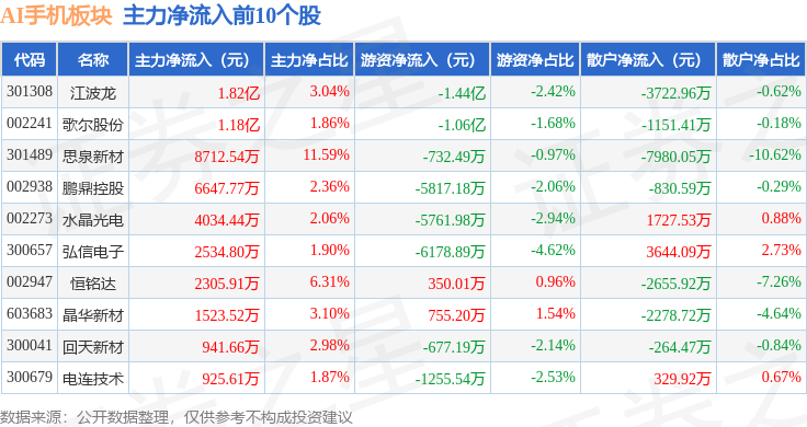 从资金流向上来看,当日AI手机板块主力资金净流出41.22亿元,游资资金净流入1.97亿元,散户资金净流入39.25亿元。AI手机板块个股资金流向见下表: