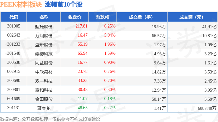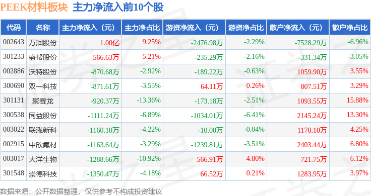 从资金流向上来看,当日PEEK材料板块主力资金净流出21.15亿元,游资资金净流入5.32亿元,散户资金净流入15.83亿元。PEEK材料板块个股资金流向见下表: