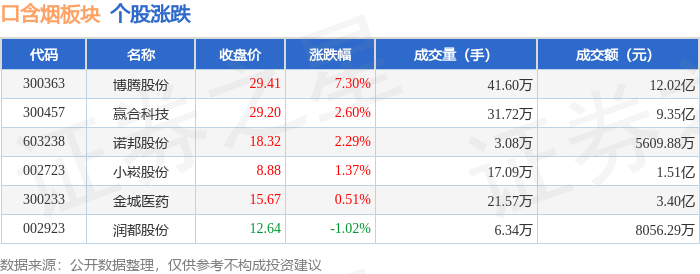 证券之星消息,1月14日口含烟板块较上一交易日上涨3.37%,博腾股份领涨。当日上证指数报收于4126.09,下跌0.31%。深证成指报收于14248.6,上涨0.56%。口含烟板块个股涨跌见下表: