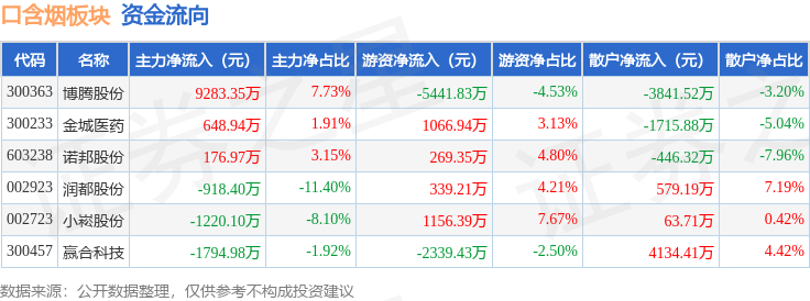 从资金流向上来看,当日口含烟板块主力资金净流入6175.77万元,游资资金净流出4949.37万元,散户资金净流出1226.41万元。口含烟板块个股资金流向见下表: