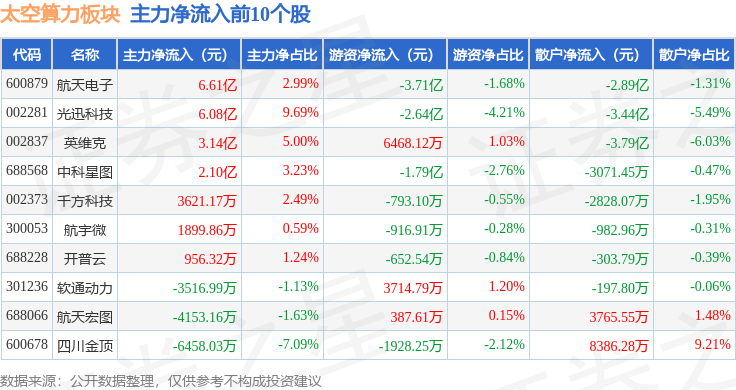从资金流向上来看,当日太空算力板块主力资金净流出28.44亿元,游资资金净流入1.05亿元,散户资金净流入27.39亿元。太空算力板块个股资金流向见下表: