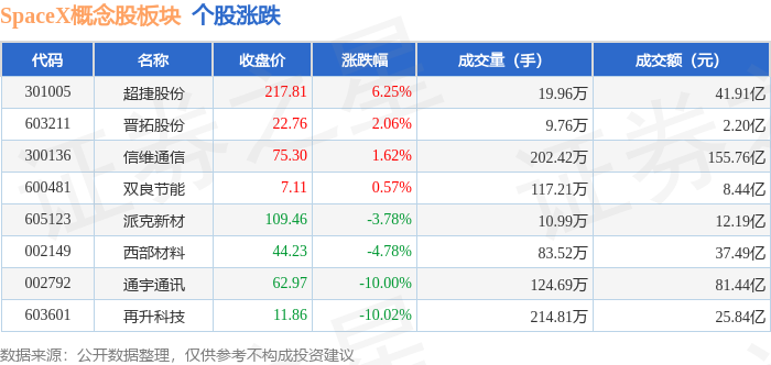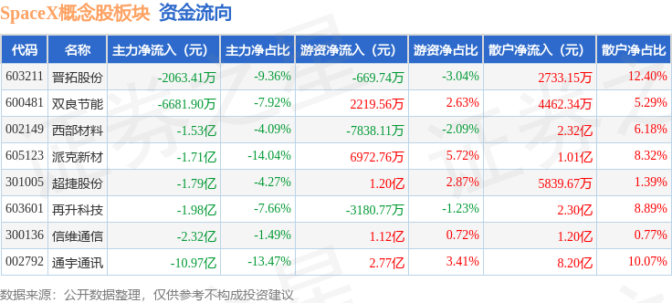 从资金流向上来看,当日SpaceX概念股板块主力资金净流出21.17亿元,游资资金净流入4.85亿元,散户资金净流入16.33亿元。SpaceX概念股板块个股资金流向见下表: