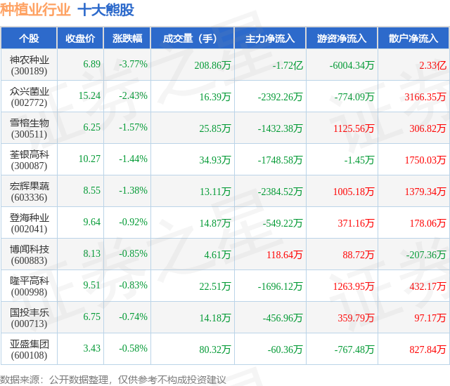 个股表现方面,种植业行业当日领跌股为神农种业(300189),该股当日报收6.89,下跌3.77%,成交量208.86万,主力资金净流出1.72亿元。众兴菌业(002772)以下跌2.43%紧随其后,该股当日成交量16.39万,主力资金净流出2392.26万元。除此之外,雪榕生物(300511)、荃银高科(300087)、宏辉果蔬(603336)均进入当日熊股之列。具体个股列表见下表: