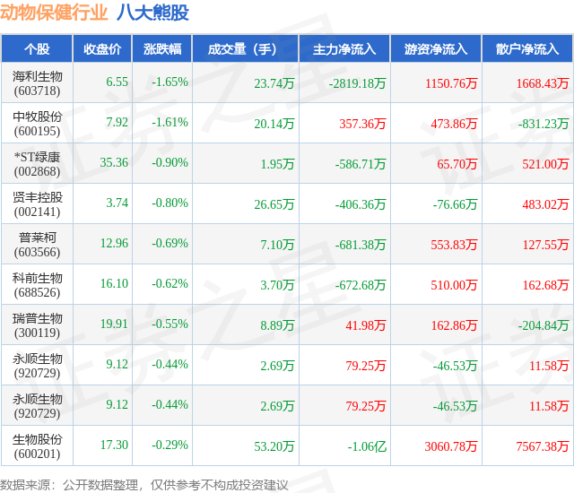 个股表现方面,动物保健行业当日领跌股为海利生物(603718),该股当日报收6.55,下跌1.65%,成交量23.74万,主力资金净流出2819.18万元。中牧股份(600195)以下跌1.61%紧随其后,该股当日成交量20.14万,主力资金净流入357.36万元。除此之外,*ST绿康(002868)、贤丰控股(002141)、普莱柯(603566)均进入当日熊股之列。具体个股列表见下表: