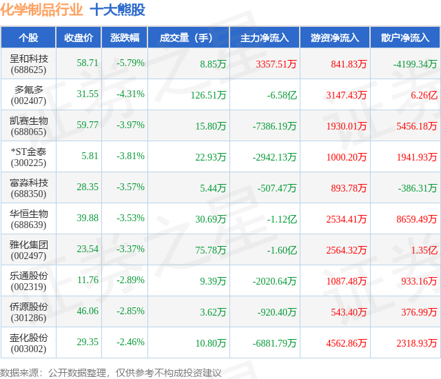 个股表现方面,化学制品行业当日领跌股为呈和科技(688625),该股当日报收58.71,下跌5.79%,成交量8.85万,主力资金净流入3357.51万元。多氟多(002407)以下跌4.31%紧随其后,该股当日成交量126.51万,主力资金净流出6.58亿元。除此之外,凯赛生物(688065)、*ST金泰(300225)、富淼科技(688350)均进入当日熊股之列。具体个股列表见下表: