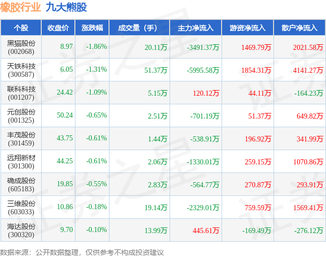 个股表现方面,橡胶行业当日领跌股为黑猫股份(002068),该股当日报收8.97,下跌1.86%,成交量20.11万,主力资金净流出3491.37万元。天铁科技(300587)以下跌1.31%紧随其后,该股当日成交量51.37万,主力资金净流出5995.58万元。除此之外,联科科技(001207)、元创股份(001325)、丰茂股份(301459)均进入当日熊股之列。具体个股列表见下表:
