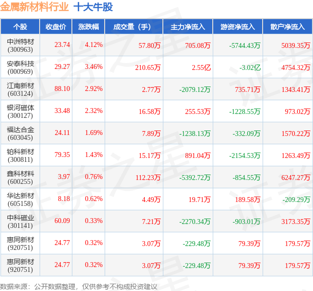 个股表现方面,金属新材料行业当日领涨股为中洲特材(300963),该股当日报收23.74,上涨4.12%,成交量57.8万,主力资金净流入705.08万元。安泰科技(000969)以上涨3.46%紧随其后,该股当日成交量210.65万,主力资金净流入2.55亿元。除此之外,江南新材(603124)、银河磁体(300127)、福达合金(603045)均进入当日牛股之列。具体个股列表见下表: