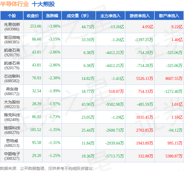 个股表现方面,半导体行业当日领跌股为兆易创新(603986),该股当日报收253.0,下跌3.98%,成交量44.73万,主力资金净流出13.26亿元。复旦微电(688385)以下跌3.15%紧随其后,该股当日成交量33.59万,主力资金净流出1.26亿元。除此之外,凯德石英(920179)、凯德石英(920179)、芯动联科(688582)均进入当日熊股之列。具体个股列表见下表: