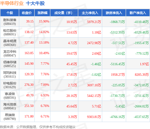 个股表现方面,半导体行业当日领涨股为耐科装备(688419),该股当日报收39.15,上涨15.9%,成交量10.95万,主力资金净流入5979.21万元。灿芯股份(688691)以上涨14.82%紧随其后,该股当日成交量13.63万,主力资金净流入1.18亿元。除此之外,晶丰明源(688368)、龙芯中科(688047)、佰维存储(688525)均进入当日牛股之列。具体个股列表见下表:
