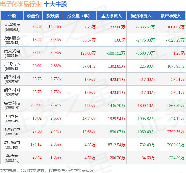 个股表现方面,电子化学品行业当日领涨股为天承科技(688603),该股当日报收93.37,上涨14.28%,成交量7.23万,主力资金净流入1232.06万元。万润股份(002643)以上涨5.04%紧随其后,该股当日成交量66.57万,主力资金净流入1.0亿元。除此之外,南大光电(300346)、广钢气体(688548)、凯华材料(920526)均进入当日牛股之列。具体个股列表见下表: