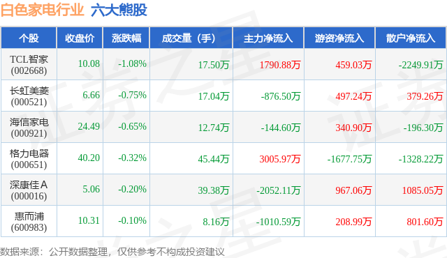 个股表现方面,白色家电行业当日领跌股为TCL智家(002668),该股当日报收10.08,下跌1.08%,成交量17.5万,主力资金净流入1790.88万元。长虹美菱(000521)以下跌0.75%紧随其后,该股当日成交量17.04万,主力资金净流出876.5万元。除此之外,海信家电(000921)、格力电器(000651)、深康佳A(000016)均进入当日熊股之列。具体个股列表见下表: