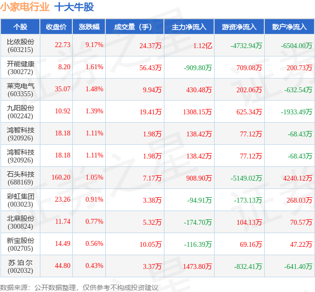 个股表现方面,小家电行业当日领涨股为比依股份(603215),该股当日报收22.73,上涨9.17%,成交量24.37万,主力资金净流入1.12亿元。开能健康(300272)以上涨1.61%紧随其后,该股当日成交量56.43万,主力资金净流出909.8万元。除此之外,莱克电气(603355)、九阳股份(002242)、鸿智科技(920926)均进入当日牛股之列。具体个股列表见下表: