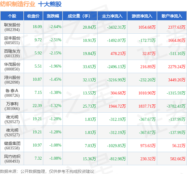 个股表现方面,纺织制造行业当日领跌股为联发股份(002394),该股当日报收18.09,下跌2.64%,成交量20.84万,主力资金净流出3432.31万元。迎丰股份(605055)以下跌2.51%紧随其后,该股当日成交量10.91万,主力资金净流出1492.07万元。除此之外,百隆东方(601339)、华茂股份(000850)、浔兴股份(002098)均进入当日熊股之列。具体个股列表见下表:
