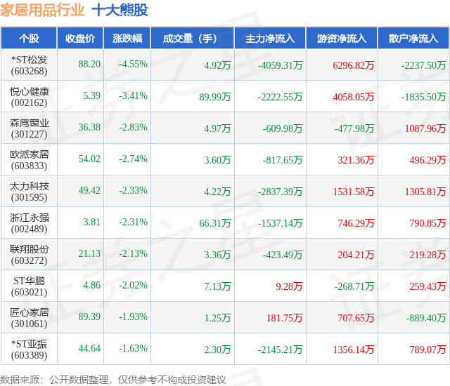 个股表现方面,家居用品行业当日领跌股为*ST松发(603268),该股当日报收88.2,下跌4.55%,成交量4.92万,主力资金净流出4059.31万元。悦心健康(002162)以下跌3.41%紧随其后,该股当日成交量89.99万,主力资金净流出2222.55万元。除此之外,森鹰窗业(301227)、欧派家居(603833)、太力科技(301595)均进入当日熊股之列。具体个股列表见下表: