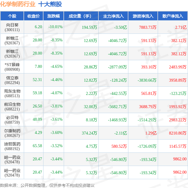 个股表现方面,化学制药行业当日领跌股为向日葵(300111),该股当日报收6.2,下跌10.01%,成交量194.59万,主力资金净流出3.5亿元。新赣江(920367)以下跌8.35%紧随其后,该股当日成交量12.69万,主力资金净流出4046.72万元。除此之外,新赣江(920367)、*ST景峰(000908)、信立泰(002294)均进入当日熊股之列。具体个股列表见下表: