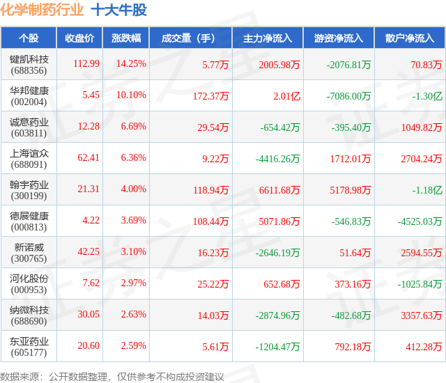 个股表现方面,化学制药行业当日领涨股为键凯科技(688356),该股当日报收112.99,上涨14.25%,成交量5.77万,主力资金净流入2005.98万元。华邦健康(002004)以上涨10.1%紧随其后,该股当日成交量172.37万,主力资金净流入2.01亿元。除此之外,诚意药业(603811)、上海谊众(688091)、翰宇药业(300199)均进入当日牛股之列。具体个股列表见下表: