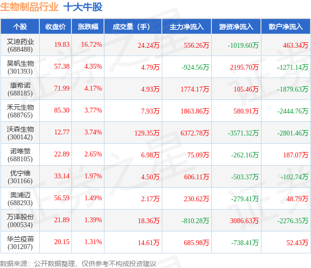 个股表现方面,生物制品行业当日领涨股为艾迪药业(688488),该股当日报收19.83,上涨16.72%,成交量24.24万,主力资金净流入556.26万元。昊帆生物(301393)以上涨4.35%紧随其后,该股当日成交量4.79万,主力资金净流出924.56万元。除此之外,康希诺(688185)、禾元生物(688765)、沃森生物(300142)均进入当日牛股之列。具体个股列表见下表:
