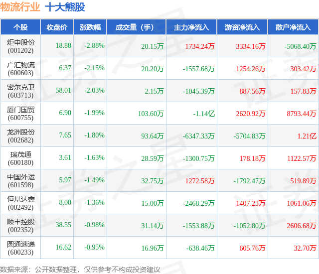 个股表现方面,物流行业当日领跌股为炬申股份(001202),该股当日报收18.88,下跌2.88%,成交量20.15万,主力资金净流入1734.24万元。广汇物流(600603)以下跌2.15%紧随其后,该股当日成交量20.2万,主力资金净流出1557.68万元。除此之外,密尔克卫(603713)、厦门国贸(600755)、龙洲股份(002682)均进入当日熊股之列。具体个股列表见下表: