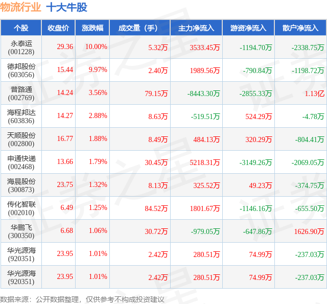 个股表现方面,物流行业当日领涨股为永泰运(001228),该股当日报收29.36,上涨10.0%,成交量5.32万,主力资金净流入3533.45万元。德邦股份(603056)以上涨9.97%紧随其后,该股当日成交量2.4万,主力资金净流入1989.56万元。除此之外,普路通(002769)、海程邦达(603836)、天顺股份(002800)均进入当日牛股之列。具体个股列表见下表: