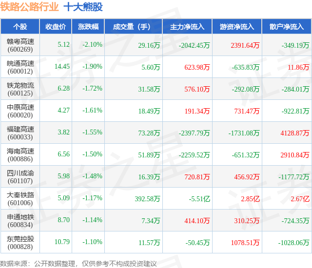 个股表现方面,铁路公路行业当日领跌股为赣粤高速(600269),该股当日报收5.12,下跌2.1%,成交量29.16万,主力资金净流出2042.45万元。皖通高速(600012)以下跌1.9%紧随其后,该股当日成交量5.6万,主力资金净流入623.98万元。除此之外,铁龙物流(600125)、中原高速(600020)、福建高速(600033)均进入当日熊股之列。具体个股列表见下表: