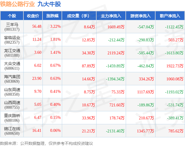 个股表现方面,铁路公路行业当日领涨股为三羊马(001317),该股当日报收56.48,上涨3.22%,成交量8.64万,主力资金净流入1669.49万元。富临运业(002357)以上涨1.81%紧随其后,该股当日成交量12.85万,主力资金净流出212.44万元。除此之外,龙江交通(601188)、大众交通(600611)、海汽集团(603069)均进入当日牛股之列。具体个股列表见下表: