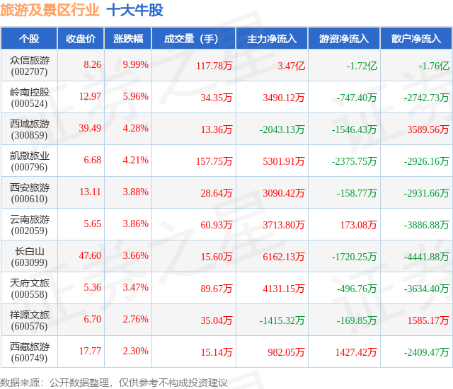 个股表现方面,旅游及景区行业当日领涨股为众信旅游(002707),该股当日报收8.26,上涨9.99%,成交量117.78万,主力资金净流入3.47亿元。岭南控股(000524)以上涨5.96%紧随其后,该股当日成交量34.35万,主力资金净流入3490.12万元。除此之外,西域旅游(300859)、凯撒旅业(000796)、西安旅游(000610)均进入当日牛股之列。具体个股列表见下表: