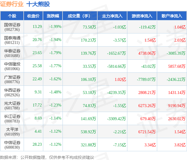 个股表现方面,证券行业当日领跌股为国信证券(002736),该股当日报收13.29,下跌1.99%,成交量73.58万,主力资金净流出1.03亿元。国泰海通(601211)以下跌1.94%紧随其后,该股当日成交量170.23万,主力资金净流出3.57亿元。除此之外,华泰证券(601688)、中信建投(601066)、广发证券(000776)均进入当日熊股之列。具体个股列表见下表:
