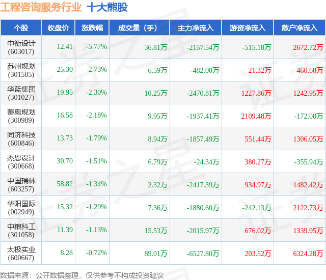 个股表现方面,工程咨询服务行业当日领跌股为中衡设计(603017),该股当日报收12.41,下跌5.77%,成交量36.81万,主力资金净流出2157.54万元。苏州规划(301505)以下跌2.73%紧随其后,该股当日成交量6.59万,主力资金净流出482.0万元。除此之外,华蓝集团(301027)、蕾奥规划(300989)、同济科技(600846)均进入当日熊股之列。具体个股列表见下表: