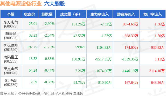 个股表现方面,其他电源设备行业当日领跌股为东方电气(600875),该股当日报收25.01,下跌2.99%,成交量101.26万,主力资金净流出2.32亿元。新雷能(300593)以下跌2.54%紧随其后,该股当日成交量42.55万,主力资金净流出1.57亿元。除此之外,优优绿能(301590)、海陆重工(002255)、英杰电气(300820)均进入当日熊股之列。具体个股列表见下表: