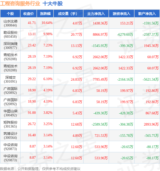 个股表现方面,工程咨询服务行业当日领涨股为山水比德(300844),该股当日报收41.71,上涨10.64%,成交量4.07万,主力资金净流入1438.36万元。勘设股份(603458)以上涨9.98%紧随其后,该股当日成交量20.77万,主力资金净流入8866.97万元。除此之外,深圳瑞捷(300977)、青矩技术(920208)、青矩技术(920208)均进入当日牛股之列。具体个股列表见下表: