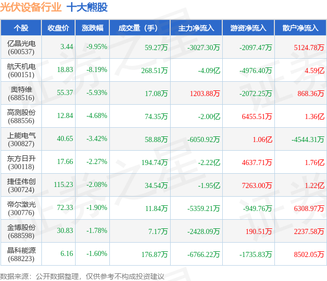 个股表现方面,光伏设备行业当日领跌股为亿晶光电(600537),该股当日报收3.44,下跌9.95%,成交量59.27万,主力资金净流出3027.3万元。航天机电(600151)以下跌8.19%紧随其后,该股当日成交量268.51万,主力资金净流出4.09亿元。除此之外,奥特维(688516)、高测股份(688556)、上能电气(300827)均进入当日熊股之列。具体个股列表见下表: