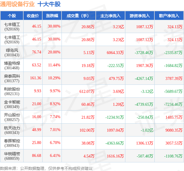 个股表现方面,通用设备行业当日领涨股为七丰精工(920169),该股当日报收46.15,上涨30.0%,成交量20.88万,主力资金净流入3.23亿元。七丰精工(920169)以上涨30.0%紧随其后,该股当日成交量20.88万,主力资金净流入3.23亿元。除此之外,绿岛风(301043)、博盈特焊(301468)、鼎泰高科(301377)均进入当日牛股之列。具体个股列表见下表:
