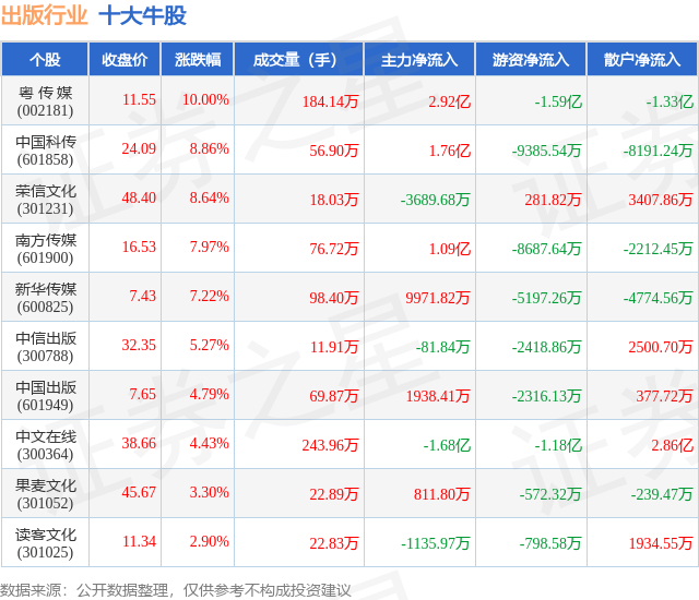 个股表现方面,出版行业当日领涨股为粤 传 媒(002181),该股当日报收11.55,上涨10.0%,成交量184.14万,主力资金净流入2.92亿元。中国科传(601858)以上涨8.86%紧随其后,该股当日成交量56.9万,主力资金净流入1.76亿元。除此之外,荣信文化(301231)、南方传媒(601900)、新华传媒(600825)均进入当日牛股之列。具体个股列表见下表: