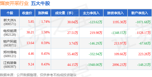 个股表现方面,煤炭开采行业当日领涨股为新大洲A(000571),该股当日报收5.85,上涨1.74%,成交量30.04万,主力资金净流出123.62万元。电投能源(002128)以上涨1.58%紧随其后,该股当日成交量27.51万,主力资金净流入219.98万元。除此之外,物产环能(603071)、郑州煤电(600121)、江钨装备(600397)均进入当日牛股之列。具体个股列表见下表: