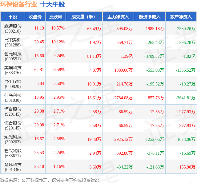 个股表现方面,环保设备行业当日领涨股为森远股份(300210),该股当日报收11.19,上涨10.57%,成交量65.49万,主力资金净流入595.08万元。*ST清研(301288)以上涨10.12%紧随其后,该股当日成交量1.97万,主力资金净流入559.71万元。除此之外,创元科技(000551)、美埃科技(688376)、*ST节能(000820)均进入当日牛股之列。具体个股列表见下表: