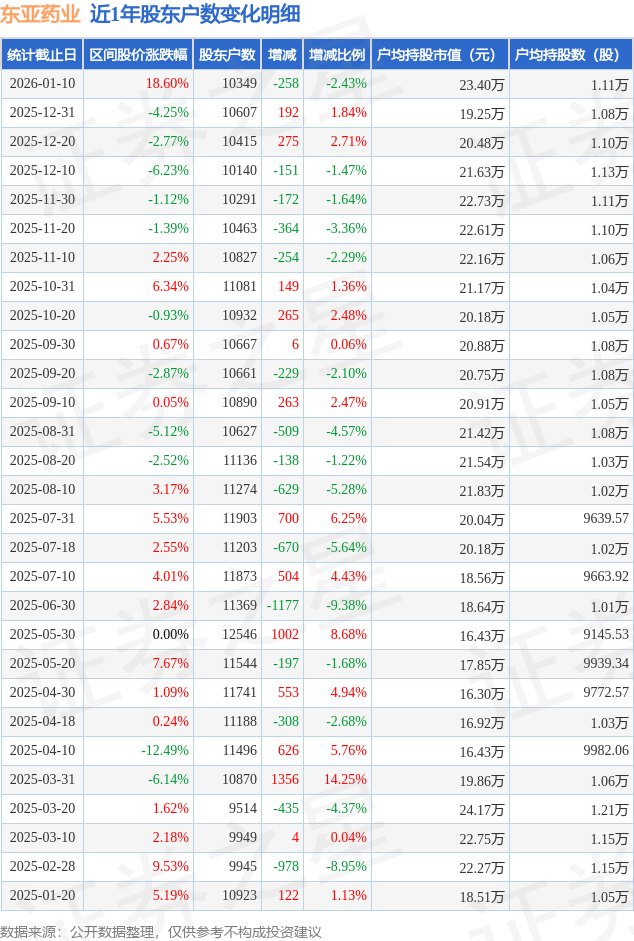 从股价来看,2025年12月31日至2026年1月10日,东亚药业区间涨幅为18.6%,在此期间股东户数减少258.0户,减幅为2.43%。