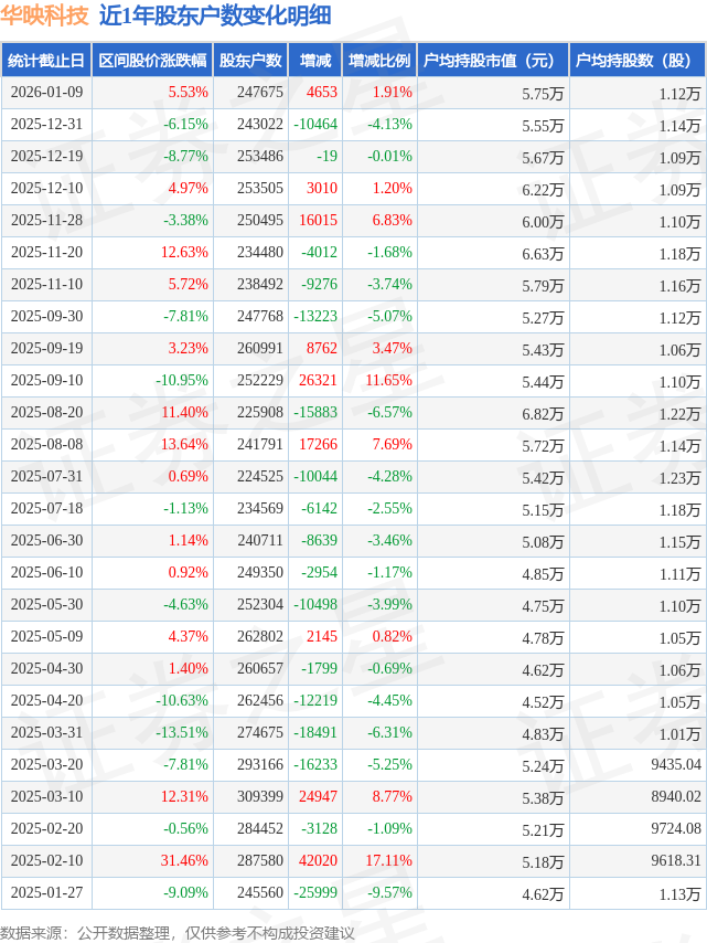 从股价来看,2025年12月31日至2026年1月9日,华映科技区间涨幅为5.53%,在此期间股东户数增加4653.0户,增幅为1.91%。