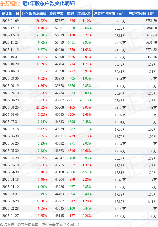 从股价来看,2025年12月19日至2026年1月9日,东方钽业区间涨幅为26.22%,在此期间股东户数增加626.0户,增幅为1.1%。