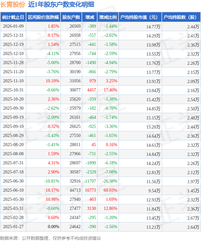 证券之星消息,近日长青股份披露,截至2026年1月9日公司股东户数为2.66万户,较12月31日减少389.0户,减幅为1.44%。户均持股数量由上期的2.41万股增加至2.44万股,户均持股市值为14.77万元。