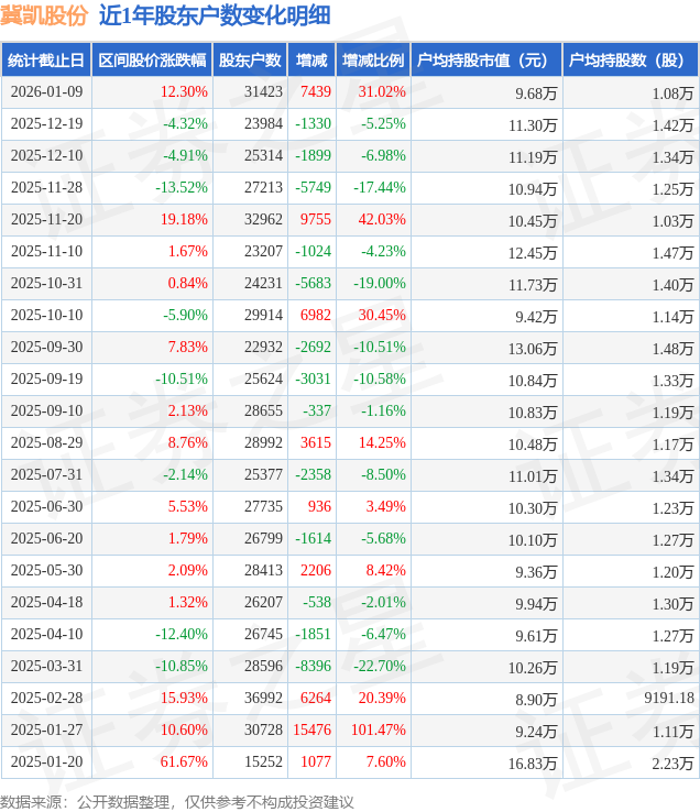 从股价来看,2025年12月19日至2026年1月9日,冀凯股份区间涨幅为12.3%,在此期间股东户数增加7439.0户,增幅为31.02%。