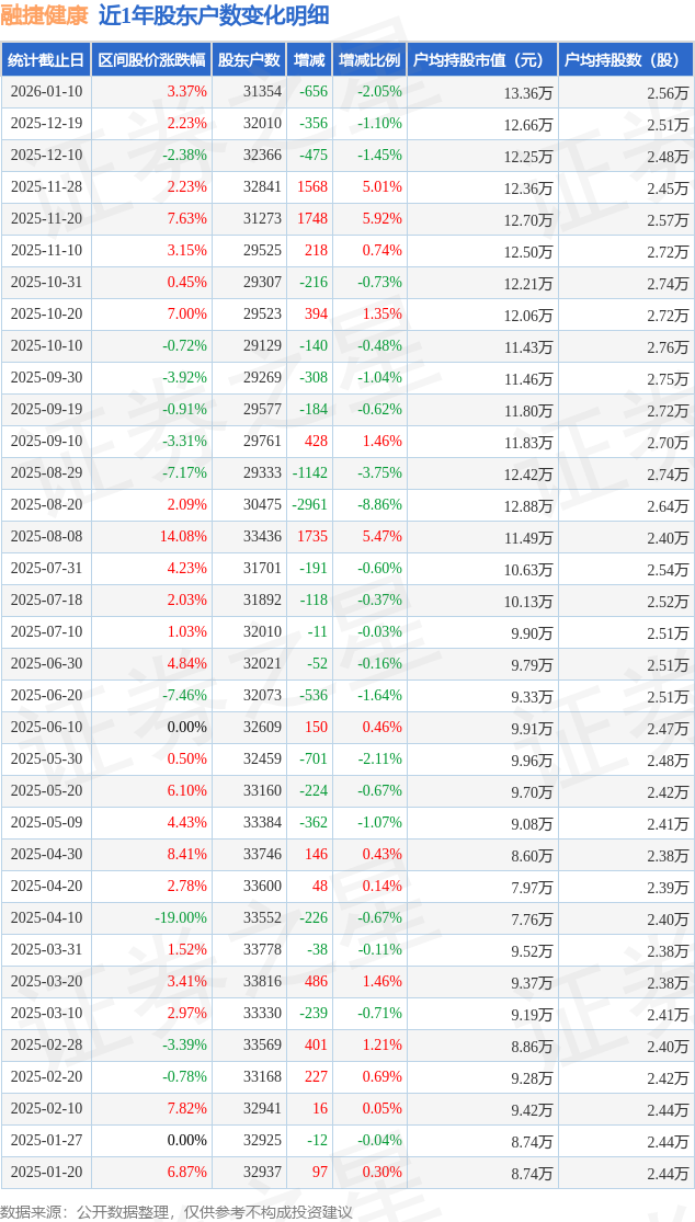 从股价来看,2025年12月19日至2026年1月10日,融捷健康区间涨幅为3.37%,在此期间股东户数减少656.0户,减幅为2.05%。