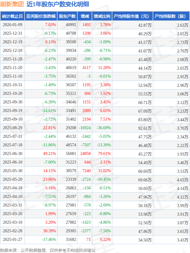 证券之星消息,近日朗新集团披露,截至2026年1月9日公司股东户数为4.1万户,较12月19日增加1492.0户,增幅为3.78%。户均持股数量由上期的2.65万股减少至2.63万股,户均持股市值为42.87万元。