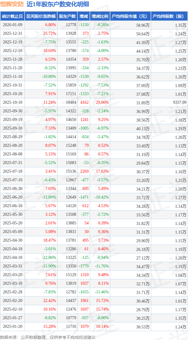 从股价来看,2025年12月31日至2026年1月9日,恒辉安防区间涨幅为6.8%,在此期间股东户数减少1150.0户,减幅为8.26%。