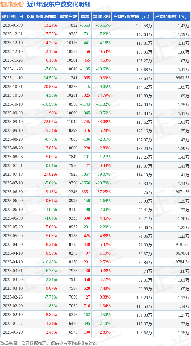 从股价来看,2025年12月31日至2026年1月9日,恒帅股份区间涨幅为13.24%,在此期间股东户数减少1563.0户,减幅为16.65%。