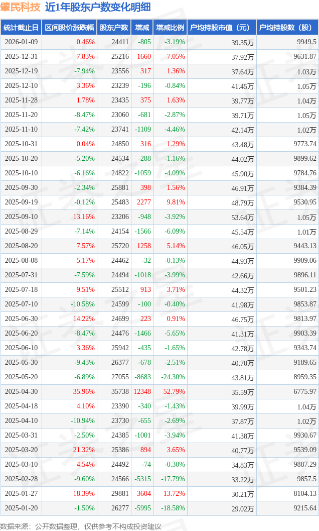 从股价来看,2025年12月31日至2026年1月9日,肇民科技区间涨幅为0.46%,在此期间股东户数减少805.0户,减幅为3.19%。
