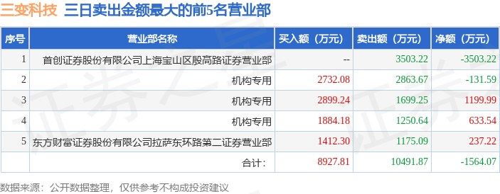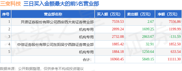 证券之星消息,沪深交易所2026年1月14日公布的交易公开信息显示,三变科技(002112)因连续三个交易日内,涨幅偏离值累计达到20%的证券登上龙虎榜。此次是近5个交易日内第1次上榜。