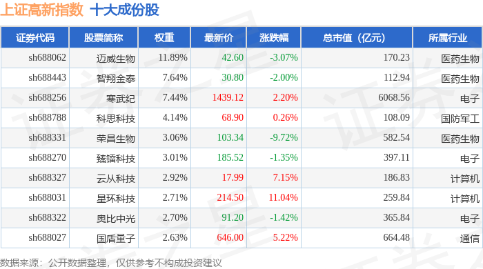 证券之星消息,1月14日,上证高新(000131)指数报收于4233.28点,涨1.33%,成交963.34亿元,换手率5.08%。当日该指数成份股中,上涨的有36家,天智航以13.25%的涨幅领涨,下跌的有14家,荣昌生物以9.72%的跌幅领跌。