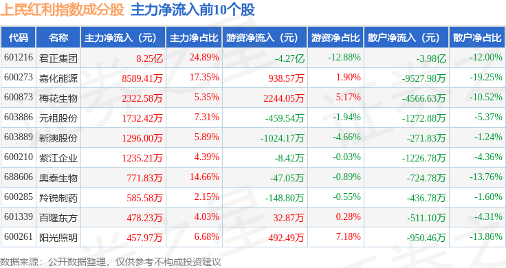 资金流向方面,上民红利(000153)指数成份股当日主力资金净流入合计6.9亿元,游资资金净流出合计2.11亿元,散户资金净流出合计4.79亿元。成份股资金流向详情见下表: