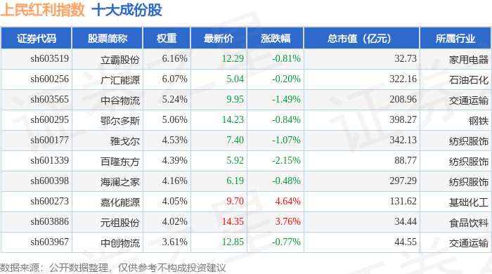 上民红利(000153)指数十大成份股详情如下: