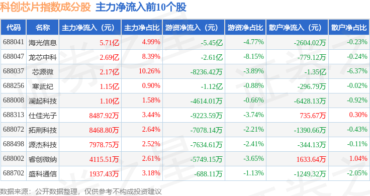 资金流向方面,科创芯片(000685)指数成份股当日主力资金净流出合计5.05亿元,游资资金净流出合计6.26亿元,散户资金净流入合计11.31亿元。成份股资金流向详情见下表: